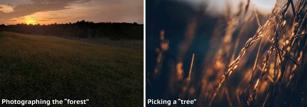U ljudskoj je prirodi da kada ugleda prekrasan prizor poželi sve zabilježiti i spremiti na fotografiji. To su situacije kada se najteže odlučiti šta bi zaista bila dobra fotka. Kao fotograf morate odlučiti na što se treba fokusirati. Treba znati odabrati stablo u šumi. Na ova dva primjera možete vidjeti razliku na primjeru slike šume i detalja koje je zapeo za oko autoru.