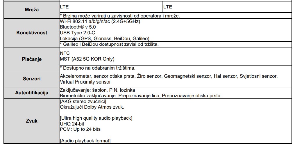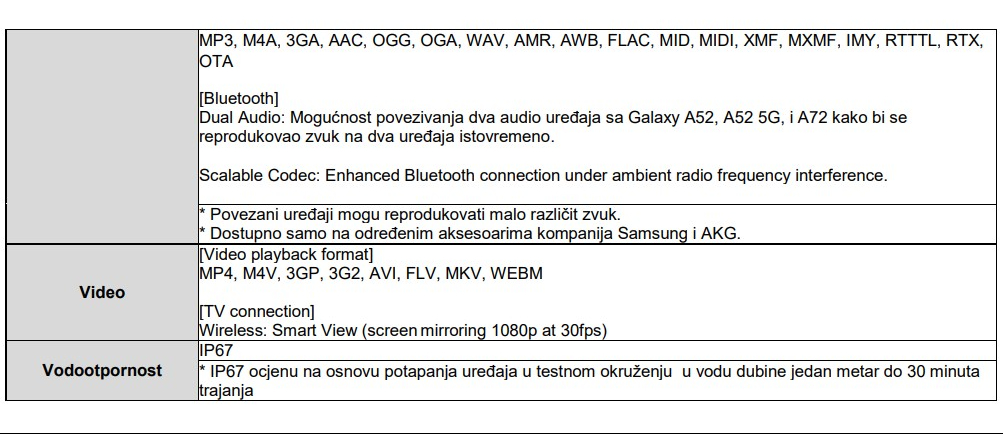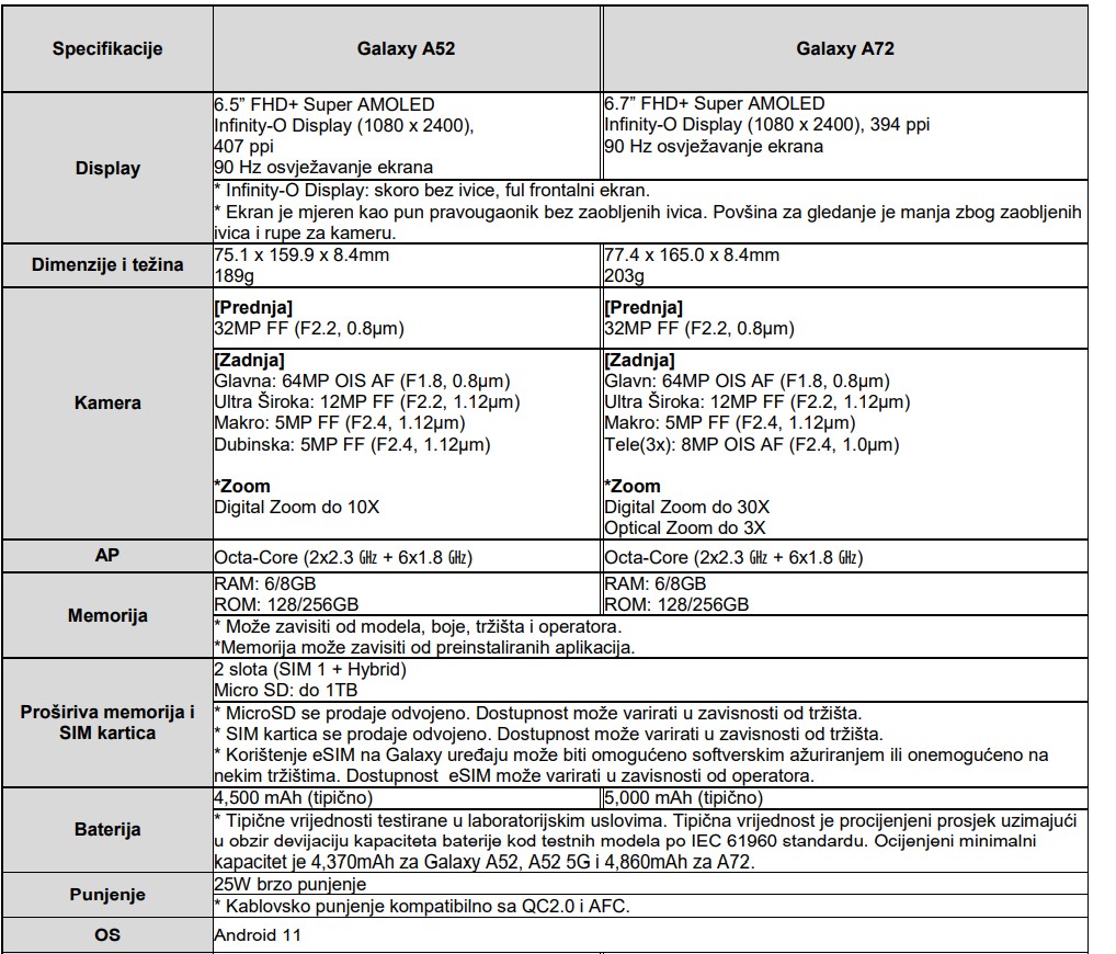- Softverska ažuriranja – Samsung uvijek teži da korisnicima pruži najnovije mobilno ažuriranje operativnog sistema. Tako je i sa novom Galaxy A serijom – A52 i A72 podržavaju tri generacije ažuriranja operativnog sistema i redovna bezbjednosna ažuriranja u trajanju od minimum četiri godine[15].