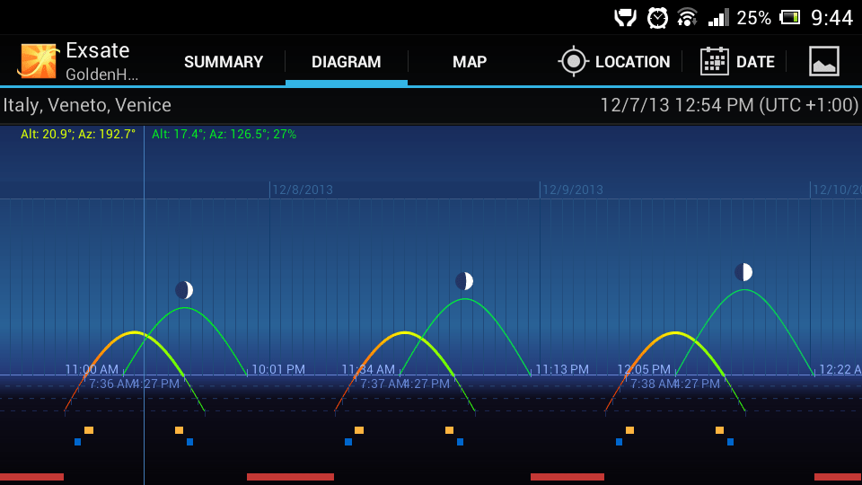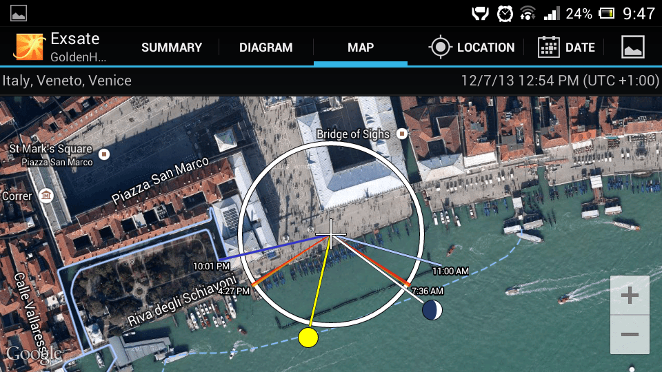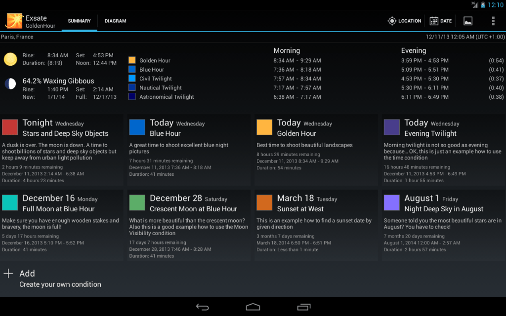 Exsate Golden Hour ne traži vezu s Internetom da bi radio, a samo jedan od razloga zašto bi svaki fotograf profesionalac ili amater trebao imati ovu aplikaciju na svojem pametnom telefonu s Androidom, krije se u činjenici da je koristan i onda kada valja kalkulisati vremena za kompleksne scenarije. Primjerice, kada je najbolje fotografirati udaljene objekte na nebu ili kada je najbolje fotografisati puni Mjesec u doba plavoga sata. U svakom slučaju – korisno.